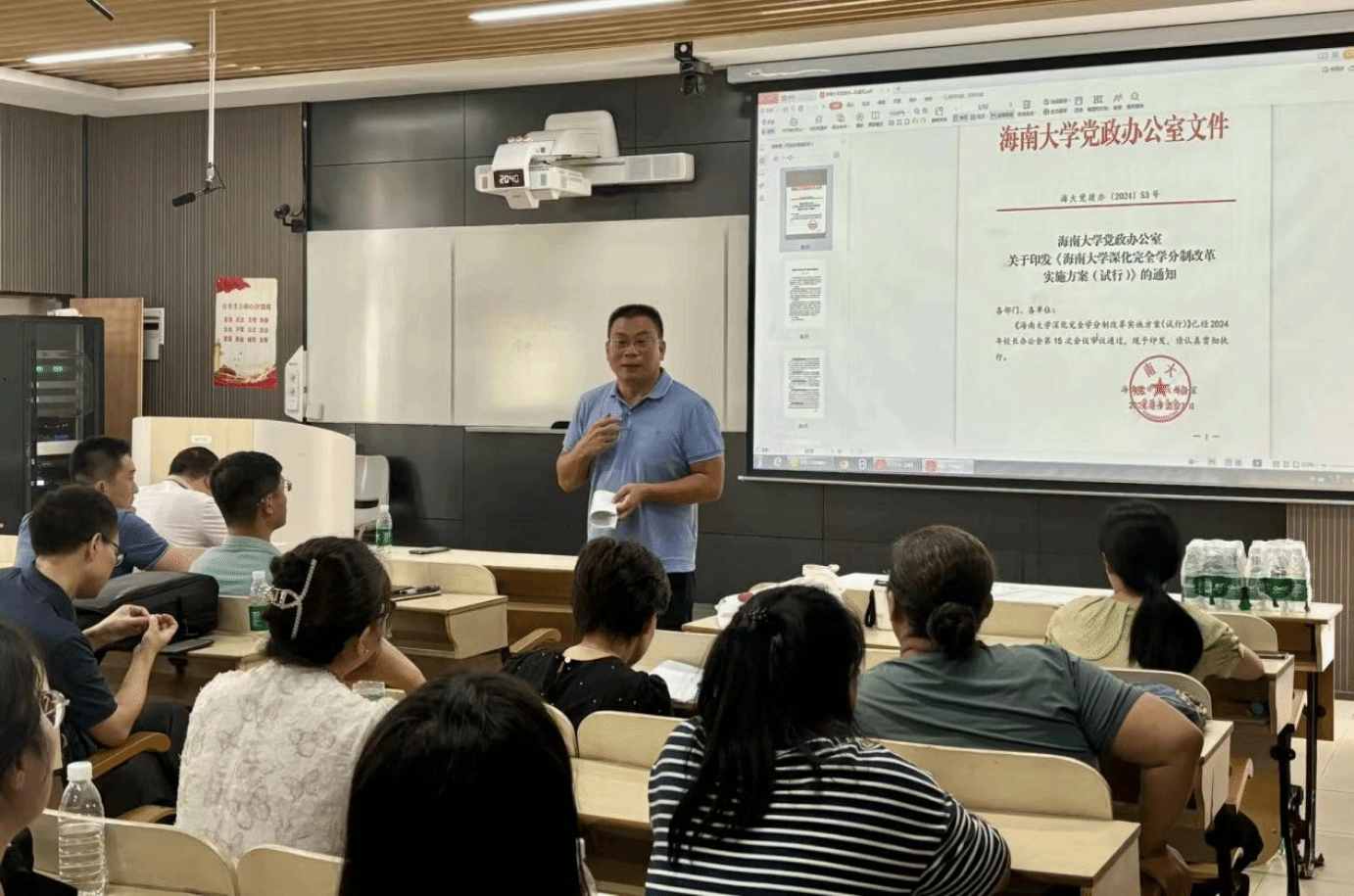 郑中兵书记带领全体教职工就《海南大学深化完全学分制改革实施方案》逐条学习,并强调应紧跟学校发展的步伐与机遇,深入实施科教兴国战略、人才强国战略、创新驱动发展战略,增强深化改革的政治自觉和行动自觉。