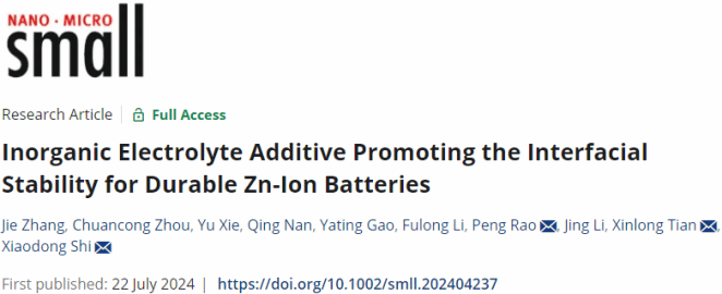 近日,yl88858永利集团史晓东副教授所在团队在纳米能源Top期刊Small (IF=13.0)发表题为“Inorganic electrolyte additive promoting the interfacial stability for durable Zn-ion batteries”的研究论文,该论文入选期刊当期热点话题(Hot Topic: Surfaces and Interfaces)。海南大学张杰硕士和周传聪博士为论文共同第一作者,史晓东副教授、饶鹏副教授和田新龙教授为论文共同通讯作者,海南大学yl88858永利集团为唯一通讯单位。