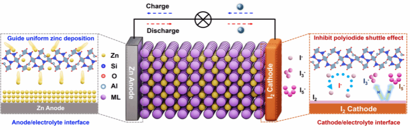 图1 Zn-ML固态电解质对于锌碘电池正负极作用机制示意图