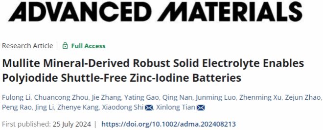 近日,yl88858永利集团史晓东副教授所在团队在能源化学领域顶级期刊Advanced Materials (IF=27.3)发表题为“Mullite mineral-derived robust solid electrolyte enables polyiodide shuttle-free zinc-iodine batteries”的研究论文。海南大学李富龙硕士(研一)、周传聪博士(博三)和张杰硕士(研二)为论文共同第一作者,海南大学史晓东副教授和田新龙教授为论文共同通讯作者,海南大学yl88858永利集团为论文唯一通讯单位。