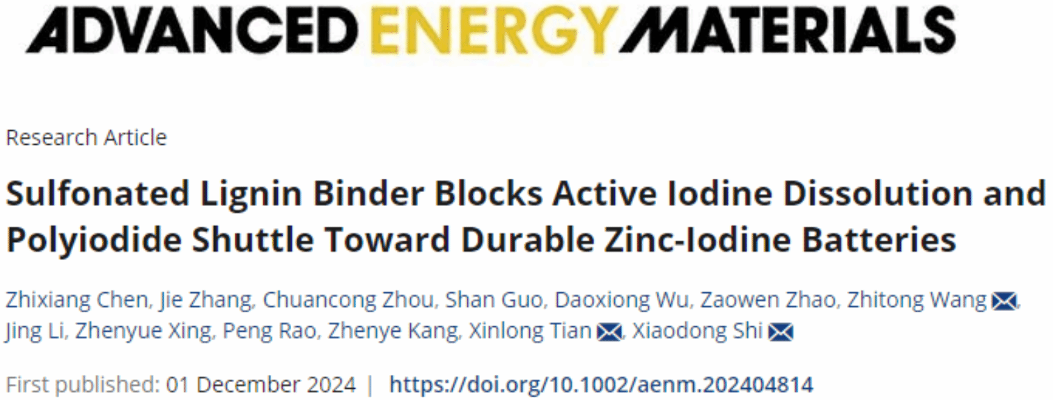 12月1日,史晓东副教授所在团队在能源领域顶级期刊Advanced Energy Materials发表题为“Sulfonated Lignin Binder Blocks Active Iodine Dissolution and Polyiodide Shuttle toward Durable Zinc-Iodine Batteries”的研究论文。海南大学研究生陈志祥(研二)、张杰(研三)和周传聪博士(博四)为论文共同第一作者,史晓东副教授、王志同副教授和田新龙教授为论文共同通讯作者。