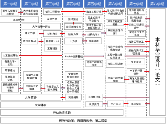 基础课程:物理海洋、海洋工程环境、海洋地质、海洋工程材料腐蚀与防护、理论力学、材料力学、流体力学、结构力学、土力学、工程制图。